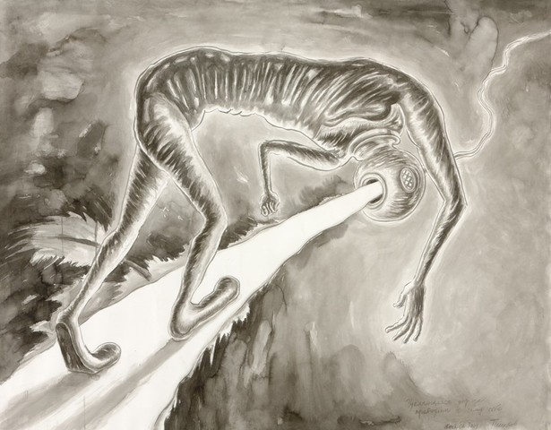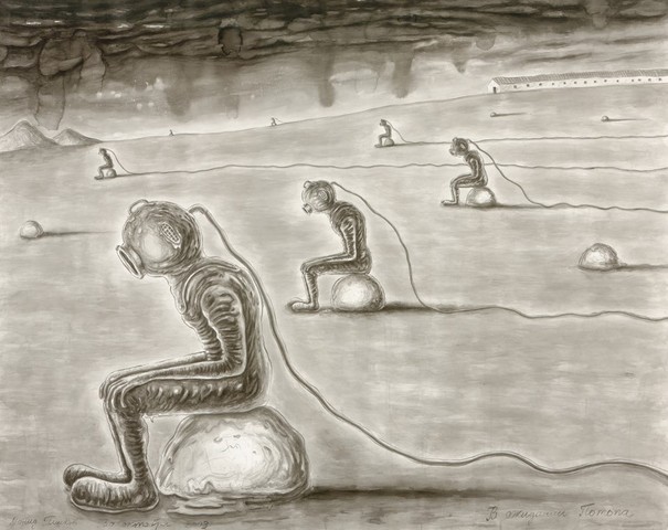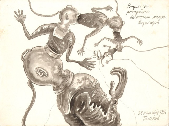 Леонид Тишков. Водолазы рождают бесконечно малых водолазов. Из серии «Водолазы». 1996. Бумага, тушь. 28x37 см.