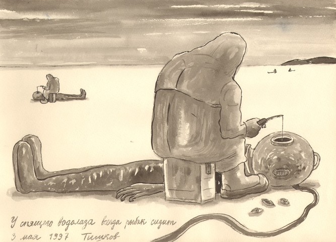 Леонид Тишков. У спящего водолаза всегда рыбак сидит. Из серии «Водолазы». 1997. Бумага, тушь. 27.5x38 см.