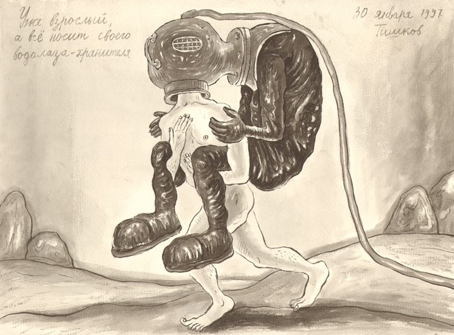 Леонид Тишков. Уже взрослый, а все носит своего водолаза-хранителя. Из серии «Водолазы». 1997. Бумага, тушь. 27.5x37.3 см.