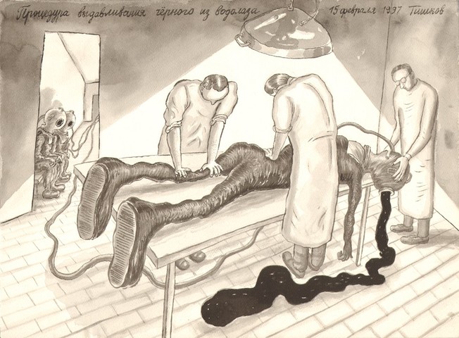 Леонид Тишков. Процедура выдавливания черного из водолаза. Из серии «Водолазы». 1997. Бумага, тушь. 27.4x37.3 см.