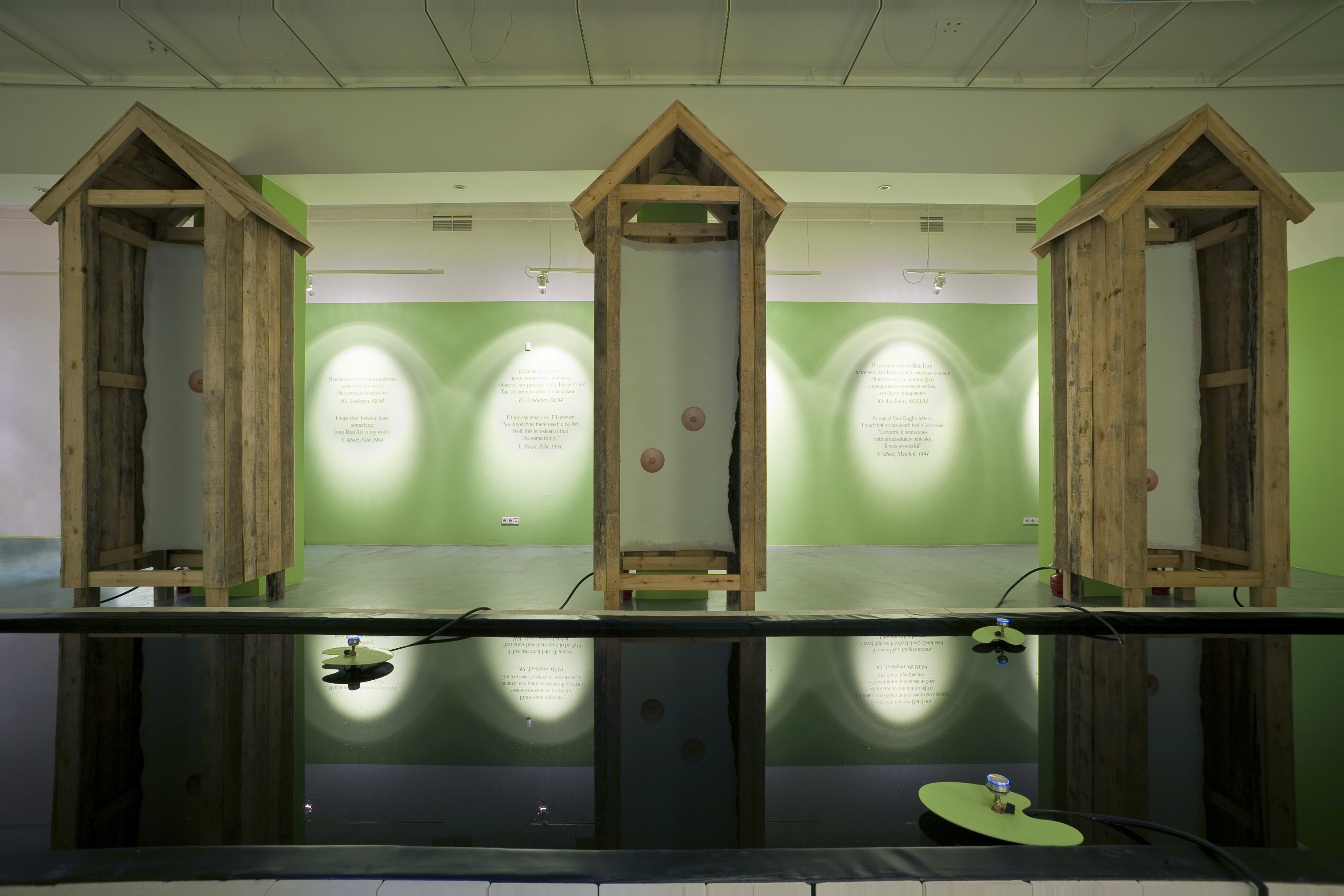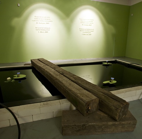 В итоге возникает инсталляция, в которой одна индивидуальная система соединяется с другими непредсказуемым образом, трансформируется подобно теме джазовой импровизации. Текстовые работы Юрия Альберта, как всегда посвященные анализу собственного творчества, оказываются фоном монументальным «исповедальным кабинкам» Виктора Скерсиса. Кабинки располагаются на краю «инфернального пруда» Андрея Филиппова (оммаж предсмертному циклу «Кувшинок» Клода Моне). А с этим последним ассоциируются три гроба, выставленные в витрине выставочного зала — еще одна работа Альберта («Кто боится красного, желтого и синего?»), отсылающая к шедеврам Александра Родченко и Барнетта Ньюмена и т. д.