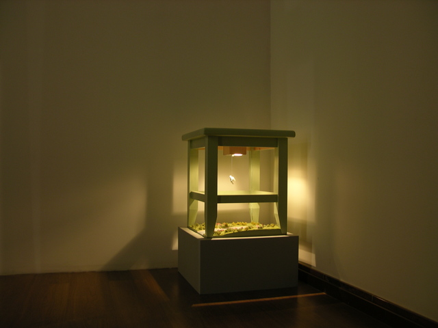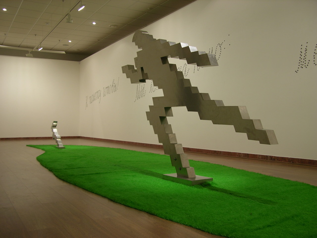 Центральное место на выставке занимает работа «Догоняющий зайца» 1997 года. Илья Кабаков пишет о ней: «Парк Горького. 50-е годы. Помните, там стояло множество гипсовых скульптур: пловцов, конькобежцев, метателей дисков? Все они стояли на пьедесталах. Я вспоминаю, что однажды, проходя мимо них, я увидел такого белого конькобежца, лежащего в траве (его свалили хулиганы), он все еще лежал в позе бегущего, не осознавая, что лежит». Инсталляция «Догоняющий зайца» состоит из двух алюминиевых скульптур: бегущего человека и зайца, расположенных на зеленом ковровом покрытии.