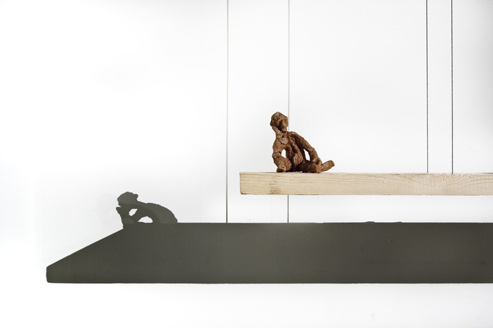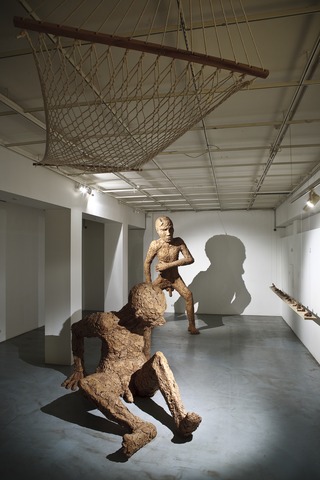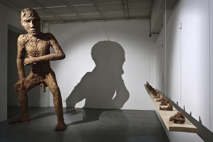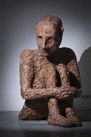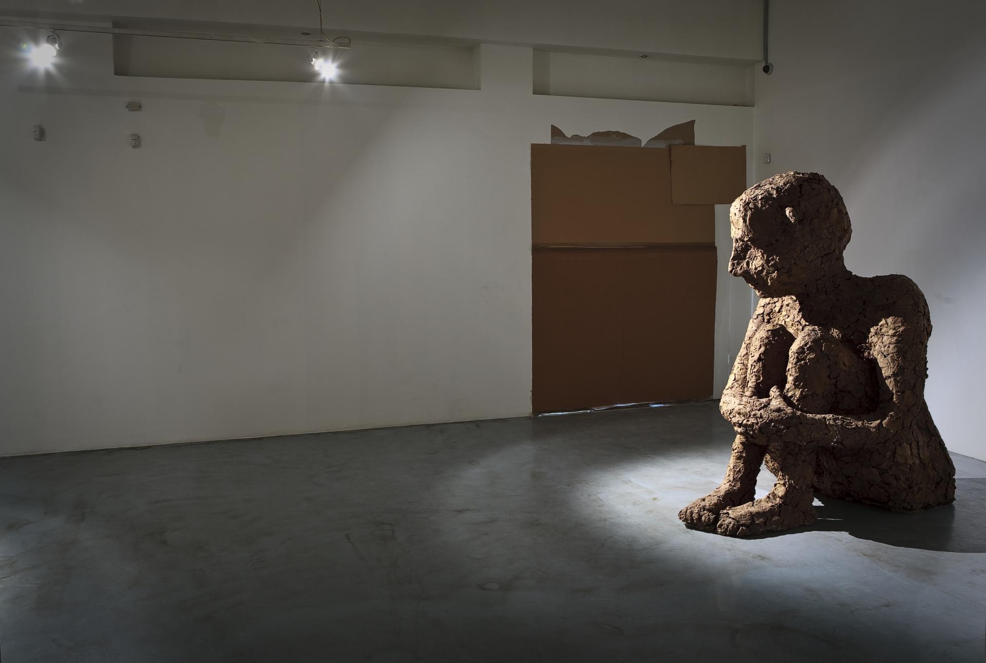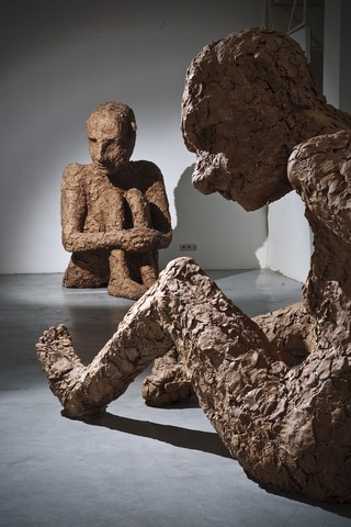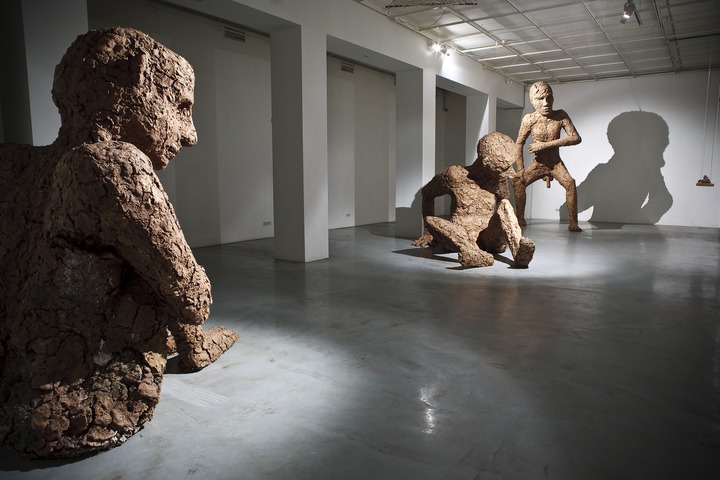 «Три голые мужские фигуры с несоразмерно большими головами, грубо слепленные из невнятного серо-коричневого вещества. Такие огромные, что неспособны справится с собственным размером и весом. Их спазматические жесты зримо свидетельствуют об отсутствии простейших навыков существования. И трудно отделаться от впечатления, будто они родились только вчера, хотя их тела уже на грани разрушения. Существа так загромождают пространство зала, что оно выглядит кукольным домом, в котором их фигуры мимолетны и неуместны. Или же, как подсказывает то же впечатление, только в туннеле нашего собственного, рутинно-убитого взгляда выглядят таковыми. А реальное их место где-то еще, куда этот взгляд пробиться не в силах.