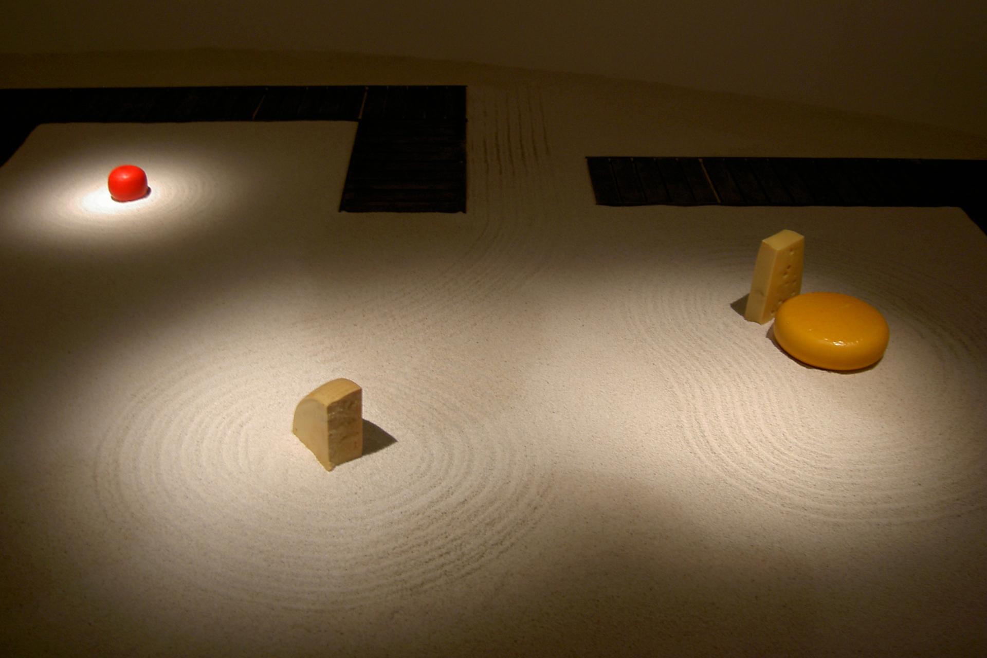 Вадим Захаров о проекте: «В основе моей инсталляция история мыши, придуманная мной когда-то: Однажды, это было очень давно, мышь залезла в миску одного старого монаха, в которой лежал огромный кусок французского сыра с неповторимым, божественным запахом. Монах увидел мышь, улыбнулся, почесал ей за ухом и сказал: «Знаешь, я дарю тебе этот кусок сыра навсегда. Поставь его в нашем монастырском саду на песок и храни его как себя саму. Потому что если ты съешь этот кусок, который больше тебя во много раз, то превратишься в слона и умрешь». С тех пор мышь не съела ни одного кусочка сыра. На следующий день тот монах навсегда исчез из монастыря. А мышь всё ещё живет и будет жить, пока лежит на песке не съеденный ею кусок сыра. Думаю, монах имел в виду очень простую вещь: нельзя понять больше, чем может вместить один единственный разум. Мышь это поняла сразу, а вот я — автор в мышиной шкурке до сих пор в полном неведении. Я ничего не понимаю. Я потерялся в пространстве и во времени. Меня мотает по странам и континентам. Моя одежда, мои мысли превратились в лохмотья разных культур, ассоциаций, и тем не менее я на том же месте, где и начал. Я сижу перед сыром в полной нерешительности и начинаю догадываться, что если я не съем сыр, я никогда ничего не пойму, но если я его съем, потеряю вечность и покой».