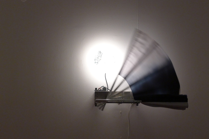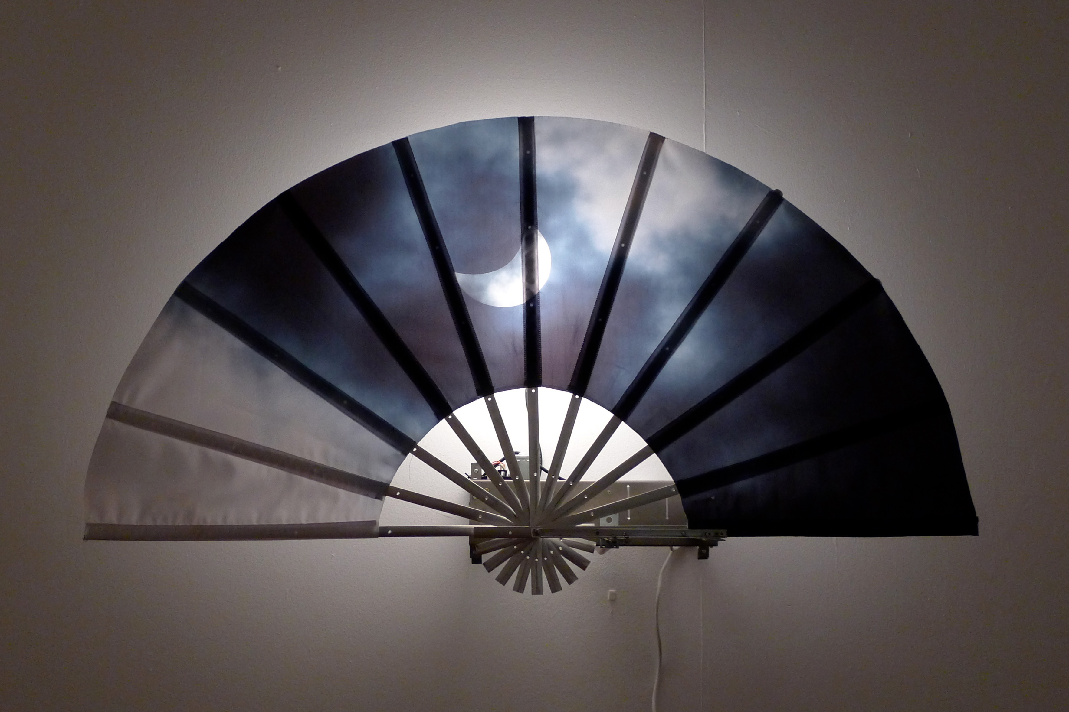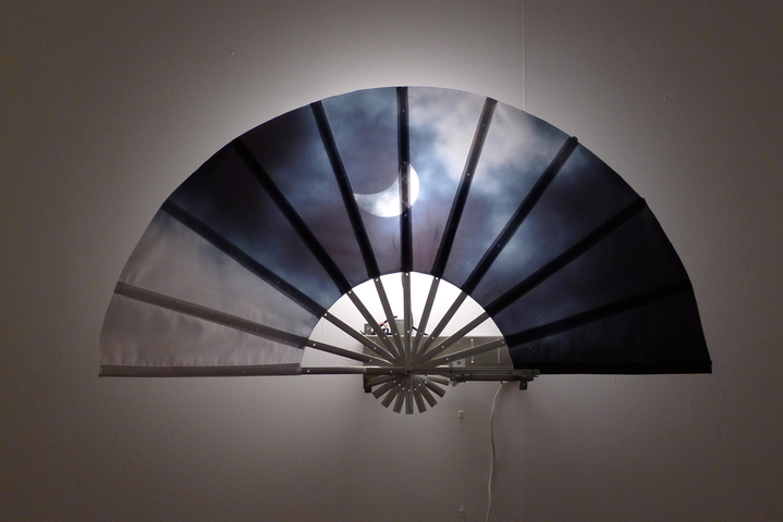 Андрей Филиппов конструирует для выставки динамические объекты, составляющие инсталляцию «Веерное отключение». И на сей раз это в буквальном смысле машинки, действительно механические конструкции — крупные веера с изображением небес, складывающиеся и разворачивающиеся благодаря работе электромоторчиков. Термин «веерное отключение» означает обусловленное технологическими причинами ограничение (полное или частичное) режима потребления электрической энергии. Однако у Филиппова такое ограничение-отключение прямо ассоциируется с Концом света в его иудео-христианской версии, а точнее, с одним из событий глобального финала, когда «небо скрылось, свившись как свиток» (Откровение Иоанна Богослова, 6:14) или, согласно Книге пророка Исаии (34:4), когда «небеса свернутся, как свиток книжный». Библейское сравнение небес со свитком художник превращает в тождество свитка и неба, а еще точнее, меняя свиток на веер, подает последний как книгу-картину небес. Так картина, книга, свиток и веер выступают у Филиппова инвариантами одной мыслеформы, историческое происхождение которой следует искать не в европейской, а в восточной, в частности, в китайской традиции. Свиток, веер и ширма там издревле служили и для записи текстов (по сути, были различными форматами книги), и в качестве основы для живописи, что выглядело более чем естественно, поскольку письменность и изображение в этой культуре выросли из общего корня и потому с легкостью объединялись. Если к тому же вспомнить, что «китайщина» всегда была важна для московских концептуалистов, и они, в известной мере, ассоциировали себя со старокитайскими учеными литераторами-художниками, то логика создания «Веерного отключения» становится еще яснее.