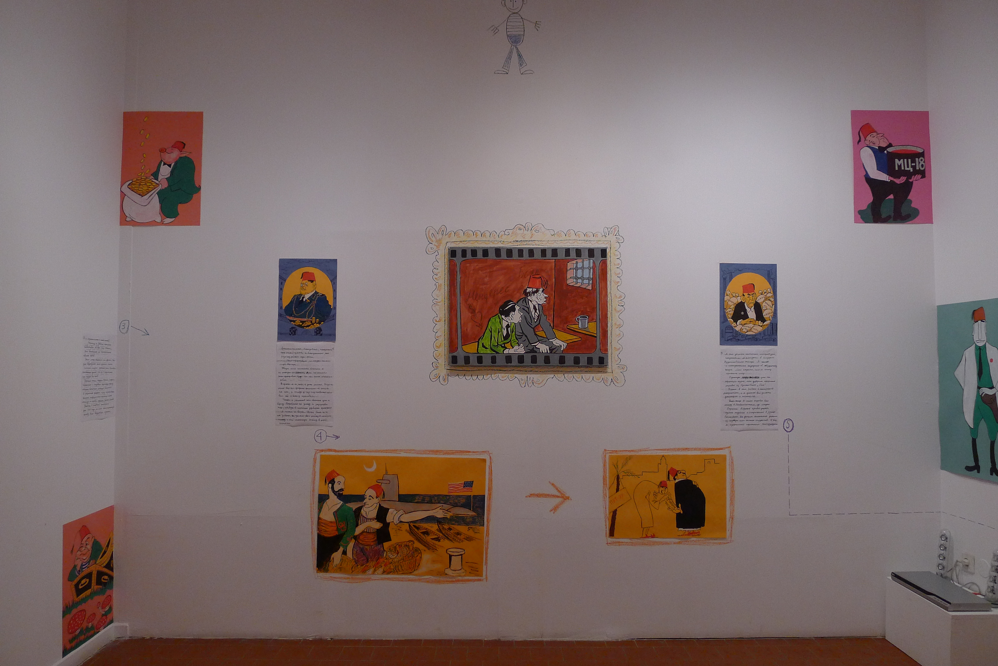 Константин Звездочетов создает для выставки настенную инсталляцию «Приключения фески»: она состоит из большой суммы графических и живописных изображений субъектов в фесках, связанных друг с другом всяческими линиями и стрелочками. Будучи самым остроумным рассказчиком среди концептуалистов, он точно знает, что увлекательный нарратив — неважно, устный, письменный или в картинках — уже сам по себе является «умной машинкой», а потому экономно обходится исключительно иллюстративно-графической конструкцией. Эта конструкция напоминает, конечно, и традиционное генеалогическое древо, но более всего обобщенное наглядное пособие коммунистических времен с его вдохновенно-бюрократическим формализмом. С единственным, но при этом решающим отличием. Звездочетовская изобразительность прямо происходит от карикатуры: он заимствует свою визуальную стилистику у художников сатирического журнала «Крокодил», бывшего любимым изданием многих поколений советских людей. Но карикатурность «Приключения фески» не просто визуальна, веселый абсурд пронизывают саму структуру инсталляции, все связи которой носят формальный, гротескно симулятивный характер. Механизм исправно работает, и единственный продукт, который он производит, это бесшумный «гул языка» (Ролан Барт), чистая материя эстетического удовольствия.
