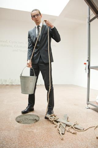 Киттельман рассказывает о проекте: «Миф о Данае, с античности и до наших дней постоянно бытующий в искусстве, получает новую интерпретацию в работе Вадима Захарова, представленной в Павильоне России. Греческий миф о божественном оплодотворении Данаи может быть прочитан по-разному: золотой дождь как метафора соблазнения Данаи отсылает к аллегории человеческих страстей и желаний, но в то же время является аллегорией развращающей власти денег. В своей инсталляции Захаров придает античному мифу современное временнóе измерение. Философские, сексуальные, психологические и культурные фрагменты собираются воедино в театрализованной композиции, которая занимает все залы павильона. Скульптурные, изобразительные, перформативные элементы создают круговорот материальных вещей (монеты, шелуха от орехов, лепестки розы и сами зрители). В этом «перформансе в пяти актах» Захаров показывает значимость мифологических воплощений обществу, которое более не питает к ним никакого доверия».