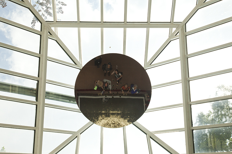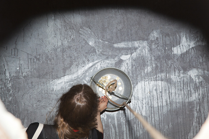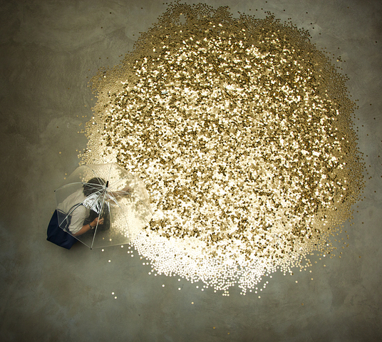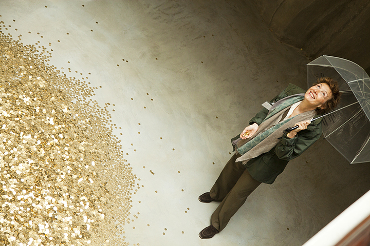 Вадим Захаров: «В инсталляции мы имеем две точки зрения — сверху и снизу (в центральном зале павильона прорублена огромная квадратная дыра в нижнее выставочное пространство, вокруг которой построена алтарная преграда с подушками для колен). Опустившись на колени и заглянув вниз, мы можем понять и ощутить, что присутствуем при уникальном процессе материализации мифа. Через огромную дыру в полу мы попадаем в другое смысловое и поэтическое пространство, куда и летят с пирамидального потолка «золотые монеты». Внизу мы видим женщин с зонтиками, которые предохраняют их от болезненных ударов монет. Нижний зал разрешено посещать только женщинам. Здесь нет никакого сексизма — лишь следование «логике анатомического строения» мифа. Мужское попадает внутрь только сверху, в виде денежного дождя. Нижний уровень павильона — «пещера-утроба», еще сохраняющая покой, знание и память».