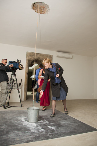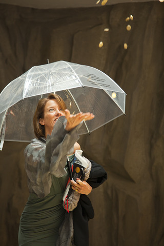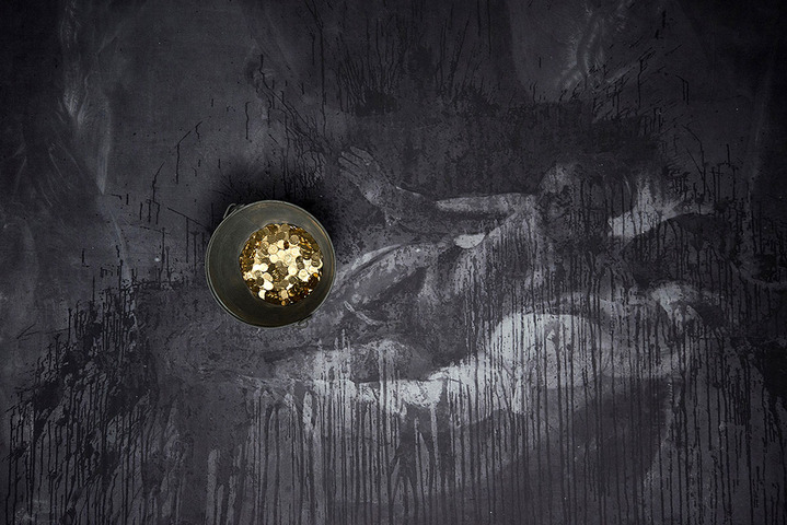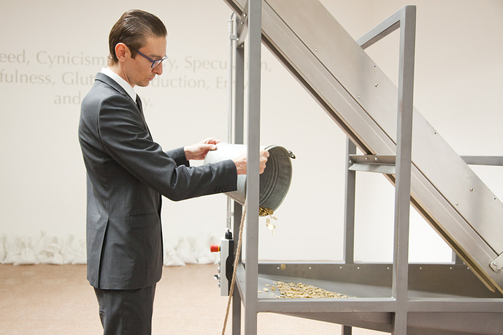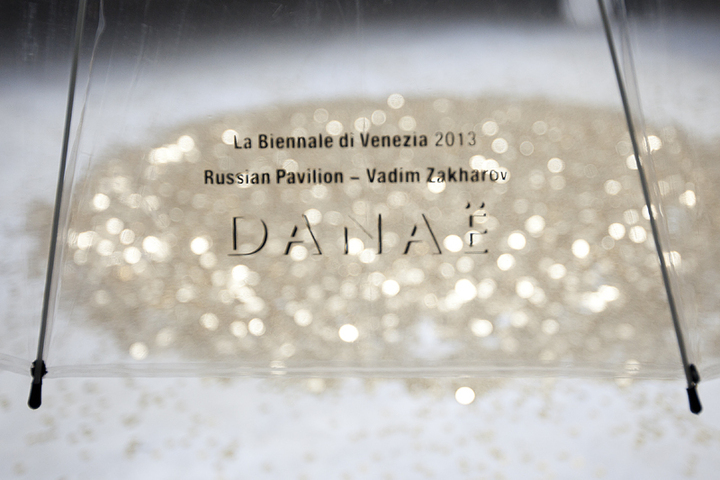 Киттельман рассказывает о проекте: «Миф о Данае, с античности и до наших дней постоянно бытующий в искусстве, получает новую интерпретацию в работе Вадима Захарова, представленной в Павильоне России. Греческий миф о божественном оплодотворении Данаи может быть прочитан по-разному: золотой дождь как метафора соблазнения Данаи отсылает к аллегории человеческих страстей и желаний, но в то же время является аллегорией развращающей власти денег. В своей инсталляции Захаров придает античному мифу современное временнóе измерение. Философские, сексуальные, психологические и культурные фрагменты собираются воедино в театрализованной композиции, которая занимает все залы павильона. Скульптурные, изобразительные, перформативные элементы создают круговорот материальных вещей (монеты, шелуха от орехов, лепестки розы и сами зрители). В этом «перформансе в пяти актах» Захаров показывает значимость мифологических воплощений обществу, которое более не питает к ним никакого доверия».